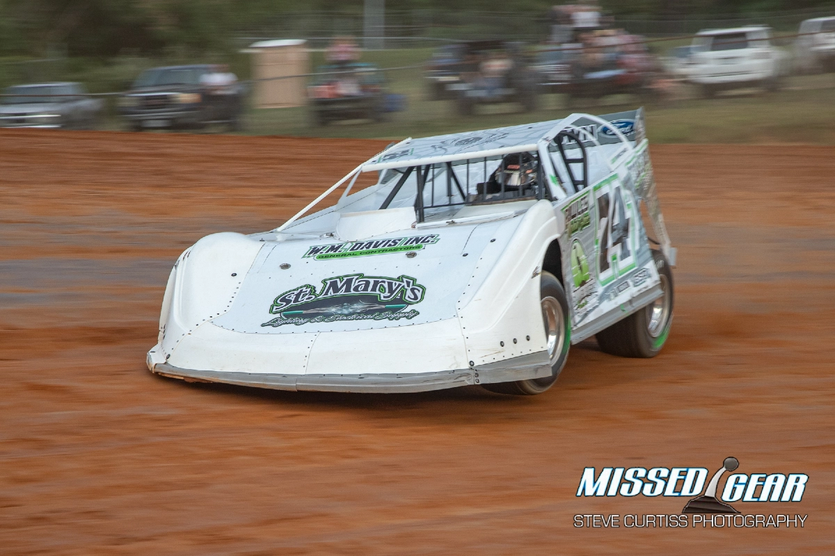 The 40 lap Late Model Main Event turned laps on a crowded track. 24 cars and drivers were sideways and practically side by side but they were chasing Tyler Bare. The race behind Bare was a bit of a free for all for position but the fastest were in the top spots. Bare took the checkers with Russell Erwin and Justin Williams behind in second and third. Derick Quade and Joe Leavell rounded the top five.