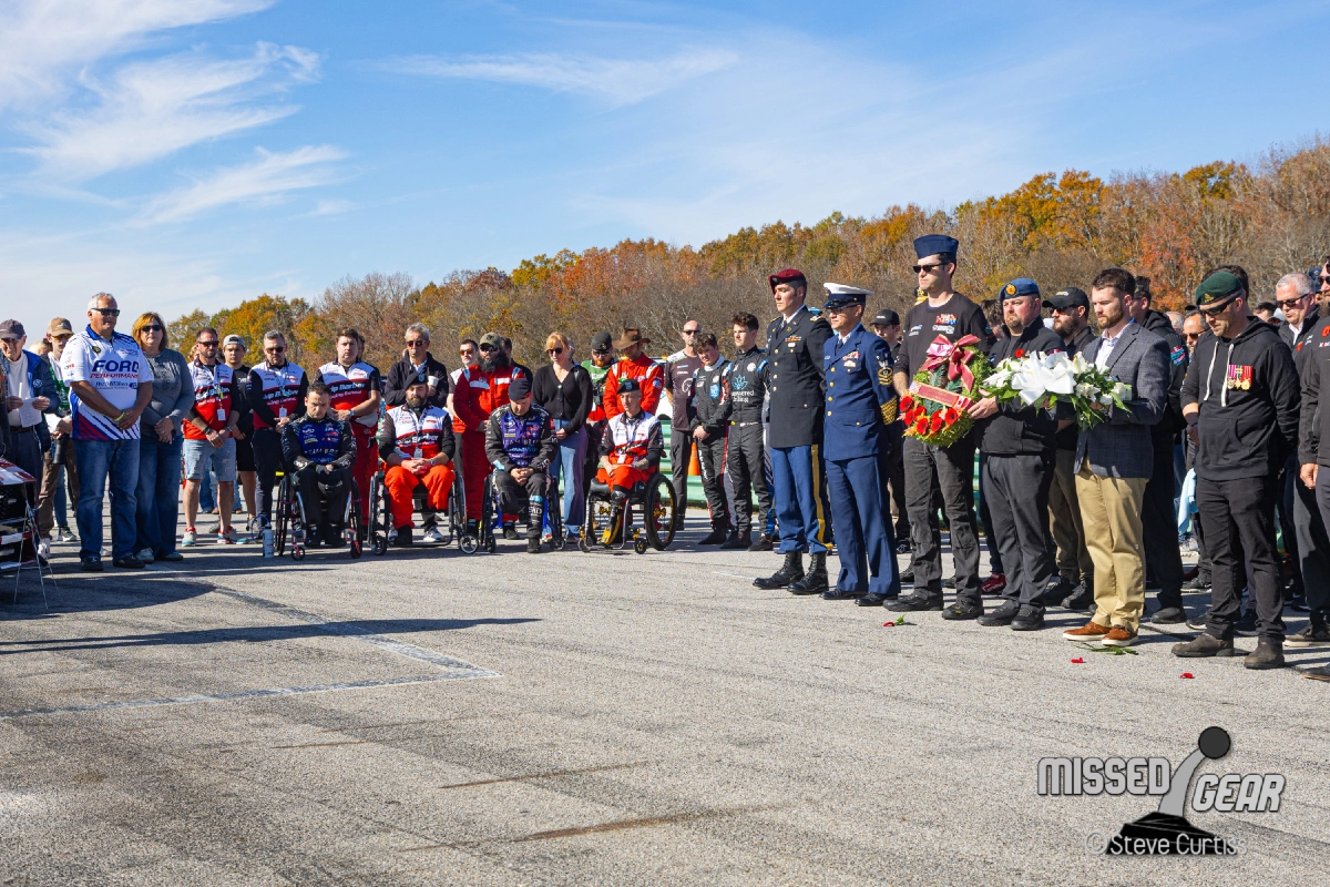 Mission Motorsport has brought the concept to the United States and on the track at VIR. The weekend before the actual Veterans Day (November 11) put veterans behind the wheel, in the crews and on the paddock for a split race format. The race was under way earlier in the morning with a scheduled stop at 10:40am. The memorial service was held in the paddock following a “11th hour, 11th month” format. Veterans stood at attention as Taps and Amazing Grace were played, wreaths were presented and silence noted the time and date of the ending of World War 1 which inspired “Armistice Day”. (That later became Veterans Day to include and honor all who have served their Country.)