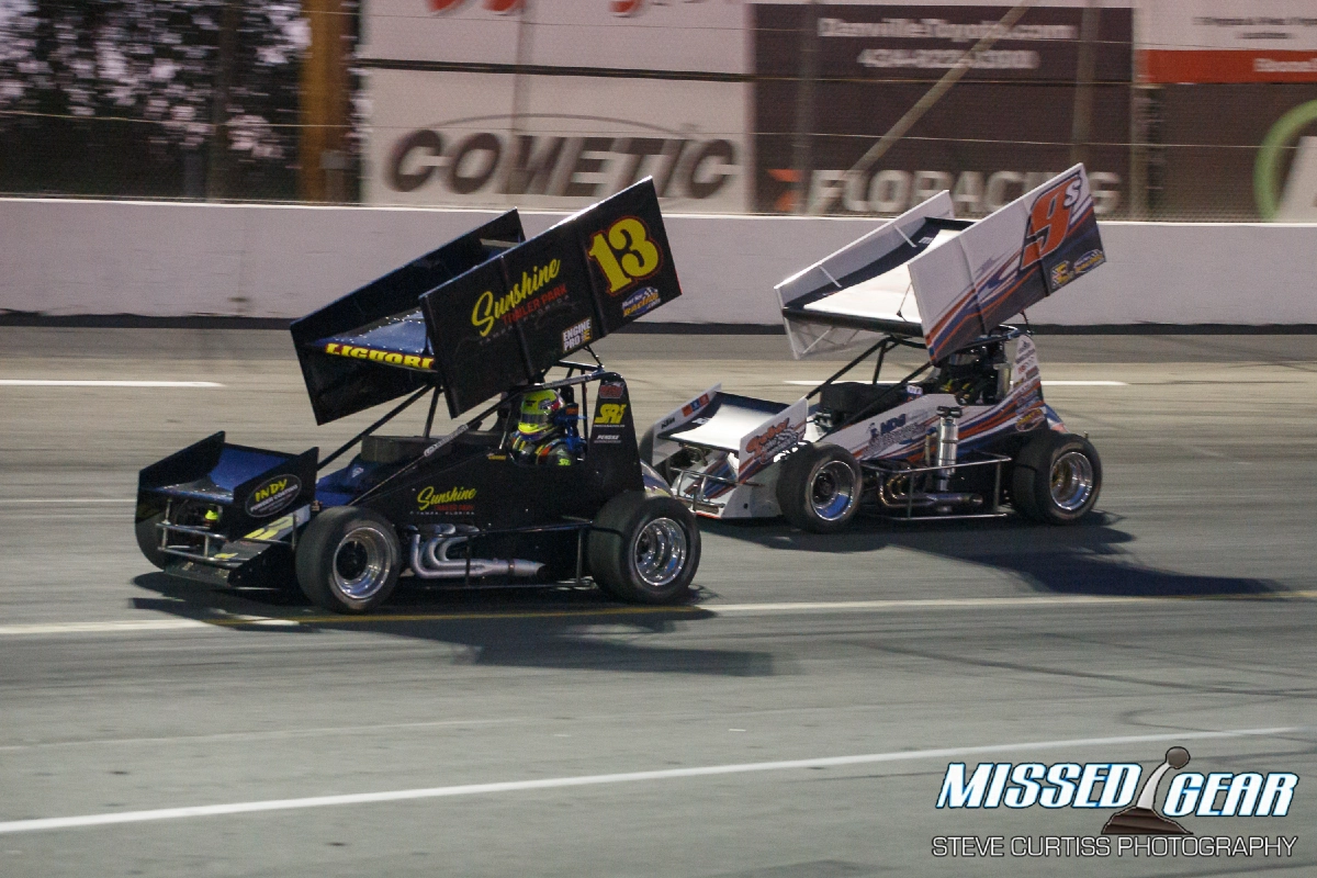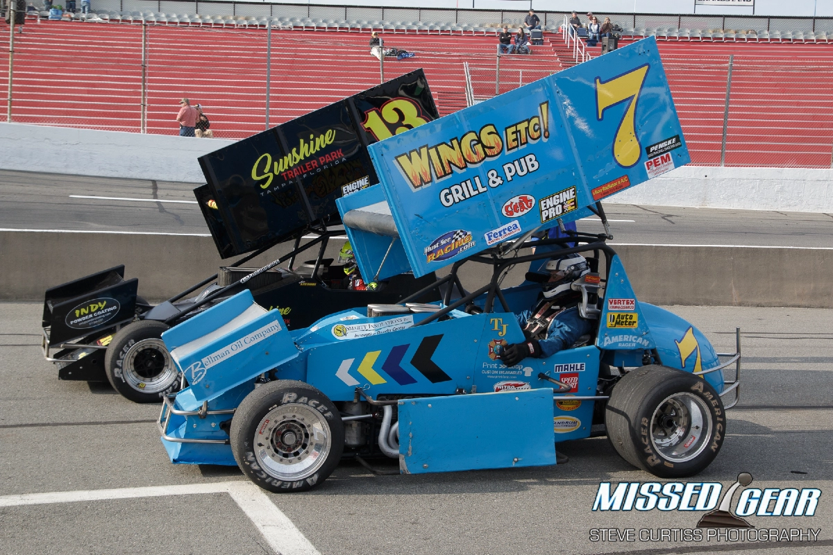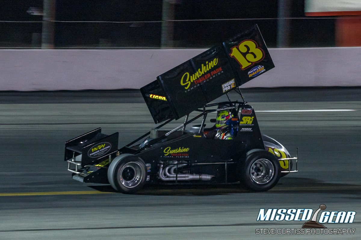 Those Sprint cars are quick! They are light and have gobs of power and the big, angled wings look off balance and a bit fragile. Somehow, it all works. Schultz made it work turning laps and marking a record time of 12.051 seconds.