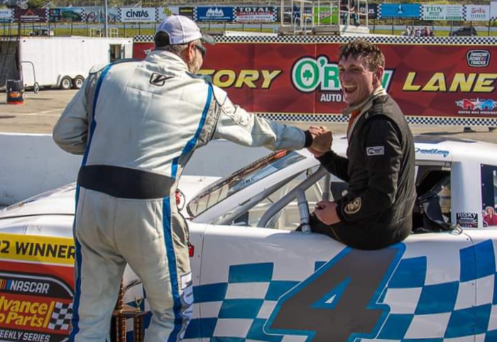 This was explained by a track official as the transponder in the #87 was not working but had actually regained the lead several laps before. This manual adjustment of the scoring did not sit well with the team that was being shown in 6th (#4 Kyle Dudley) spot which prompted some heated words and what appeared to be a “fighting posture” on the front stretch concerning the contact that had put the #4 down with a rear flat. Some fun words were exchanged… Maybe an unsanctioned hand gesture…